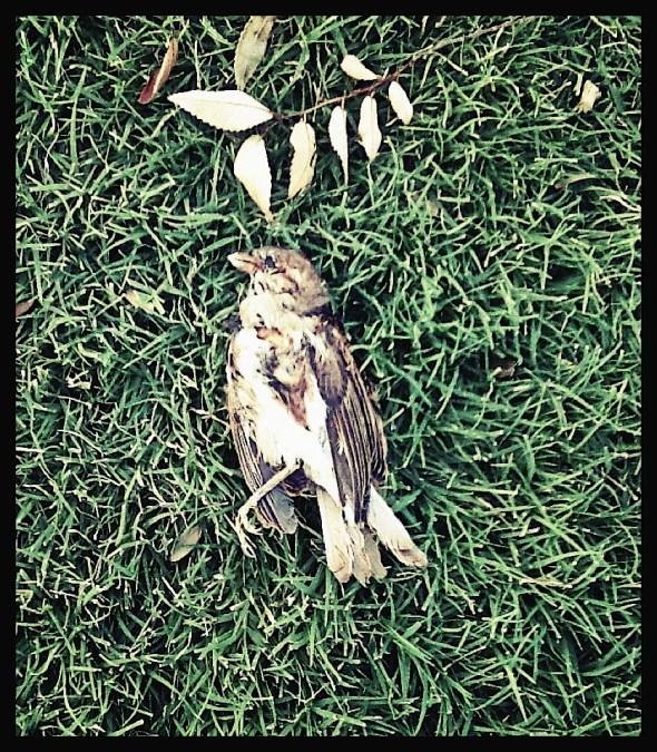 When I found this little bird, I was with my kid and friends, in Oklahoma City, walking in the parking lot of a mall. Our original mission was to shop for a dress for a teenager, to wear to her father’s second wedding, which had triggered a sense of melancholy in the teen. The mall was enough melancholy for me. After we parked, our mission changed.